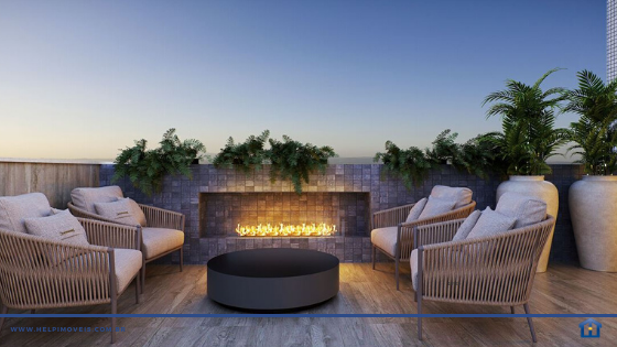 · TERRAÇO: Lareira ecológica, piso porcelanato amadeirado, cadeiras em junco sintético com almofadas impermeáveis. Integração com salão de festas e com a piscina e vista superior para o Kobrasol.